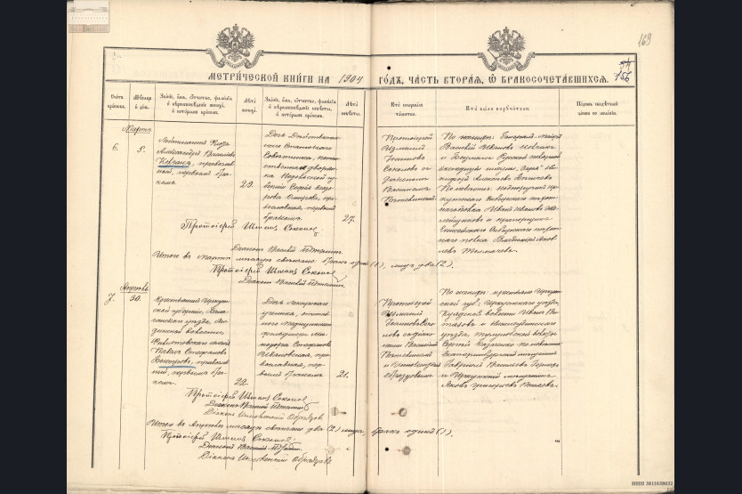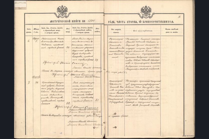 8. Метрическая запись от 5 марта 1904 г. О венчании лейтенанта флота А.В. Колчака и дочери действительного статского советника, потомственной дворянинки Подольского губернии С.Ф. Омировой