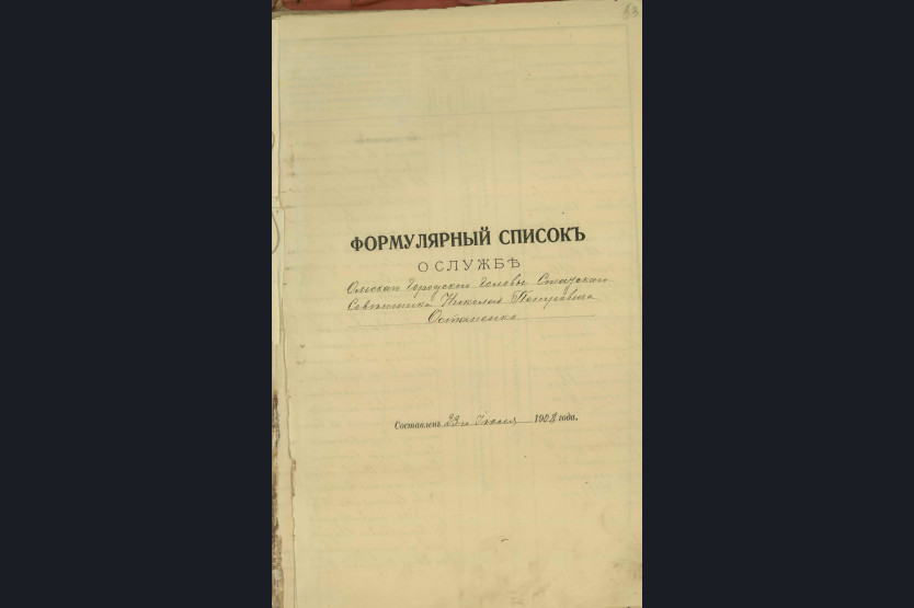 Название документа: Формулярный список о службе Омского городского головы, статского советника Николая Петровича Остапенко с 1877 по 1910 гг. Подлинник, рукопись